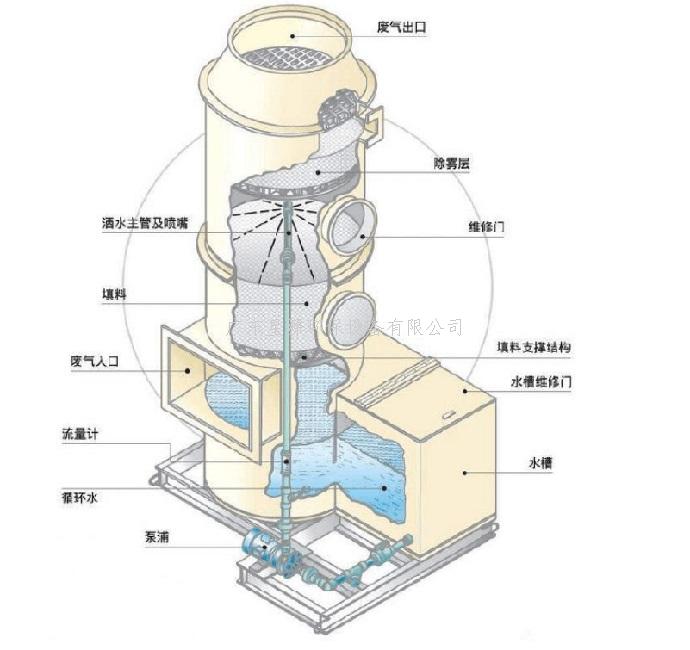 工業(yè)廢氣由風(fēng)管引入噴淋水塔,經(jīng)過(guò)填料層,廢氣與水及藥劑進(jìn)行充分的氣液接觸,廢氣經(jīng)過(guò)物理吸附及化學(xué)反應(yīng)后,再經(jīng)除霧板脫水除霧后由風(fēng)機(jī)排入大氣。